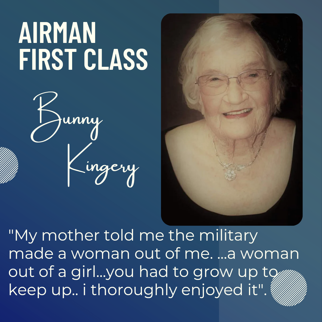This week, hear the story of “Bunny” Kingery. She is one of the first women to serve in the Air Force from 1950-1953 and she tells her story of how it was serving at that time. Bunny is 90 years old at the time of this recording as she shares the wit and wisdom she has gathered over the years. She married her husband who was serving in the Army whom she met while performing in a traveling show to entertain troops at remote installations in Europe. When she became pregnant with her first of 6 children, she was discharged. At that time, you could not serve as a woman with children. Bunny is extremely proud of being a veteran, mother, grandmother and great grandmother.